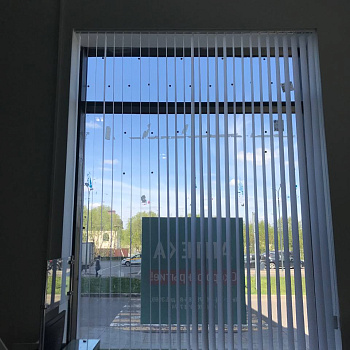 Строгие вертикальные жалюзи из полупрозрачной ткани – практичный и функциональный выбор для торгового зала аптеки. Ткань обработана специальной пропиткой, отталкивающей пыль и не дающей загрязнениям впитываться в материал. Потому уход за жалюзи прост, их нужно лишь регулярно протирать щёткой или микрофиброй.